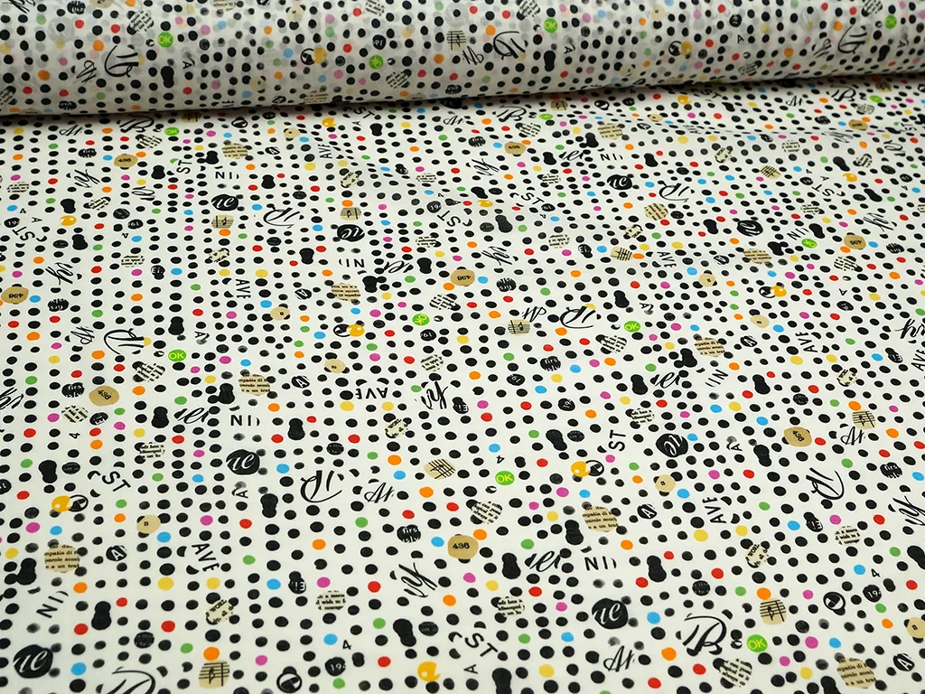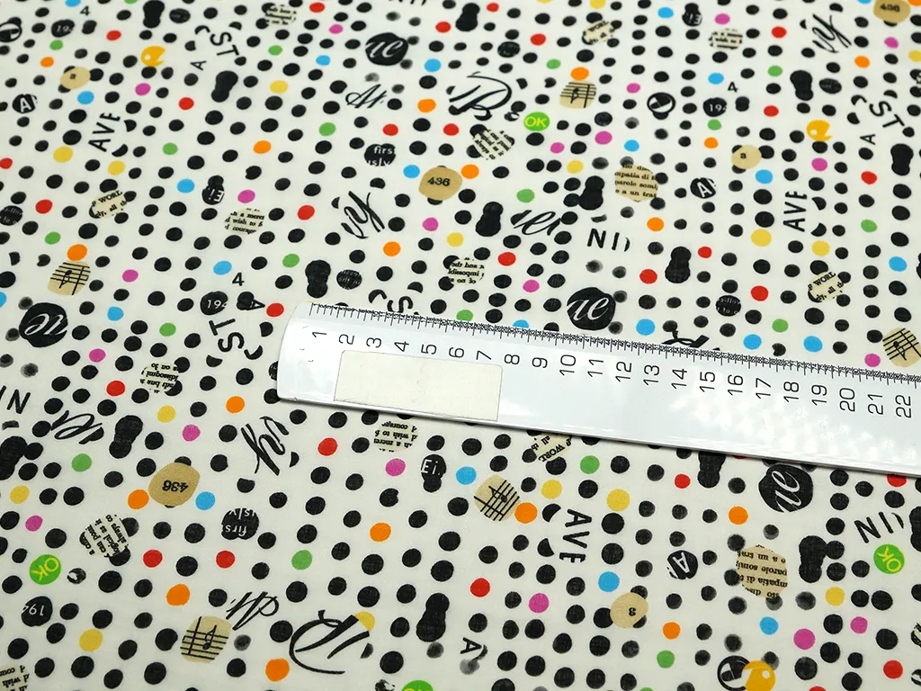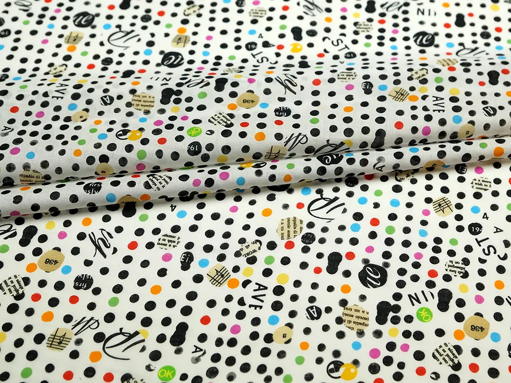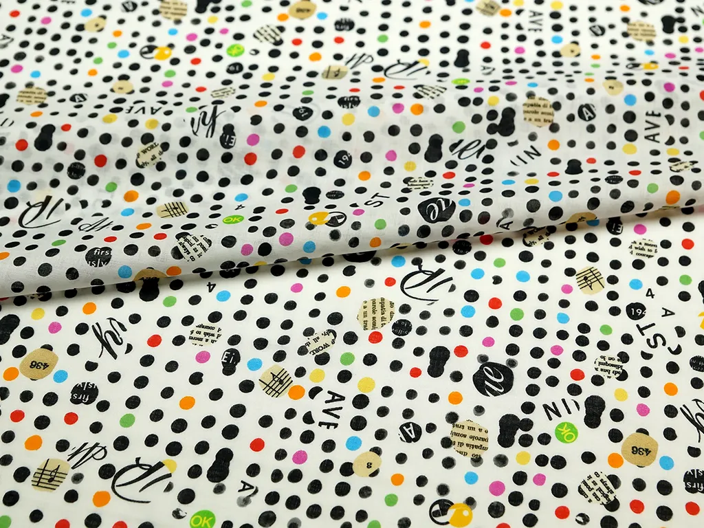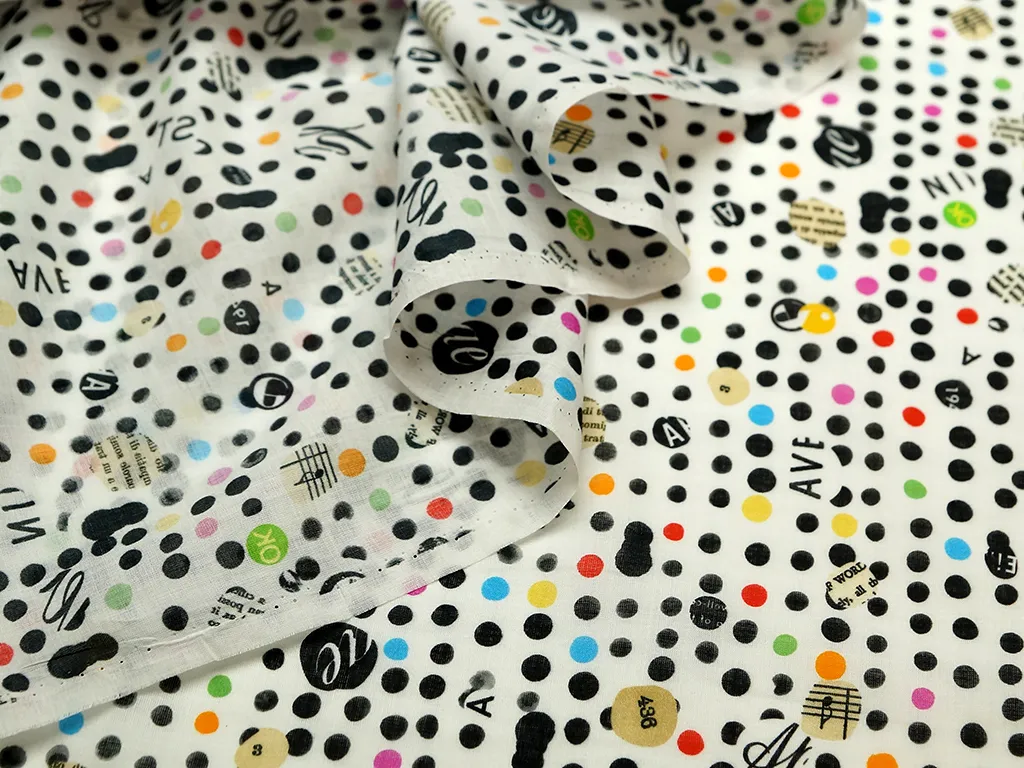 Прекрасный хлопковый батист на белом фоне яркие горошки и надписи. Ткань полупрозрачная, легкая, воздушная. Идеально для летнего сарафана, платья или блузы.