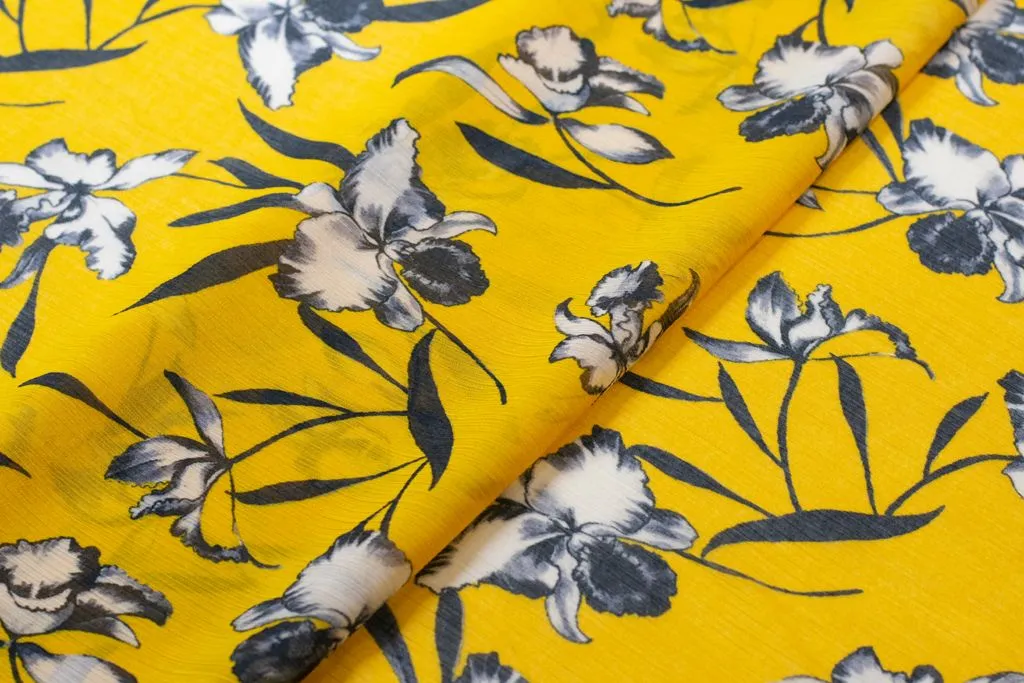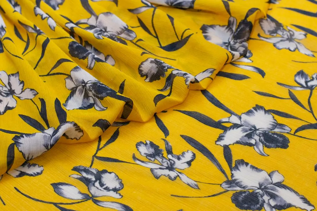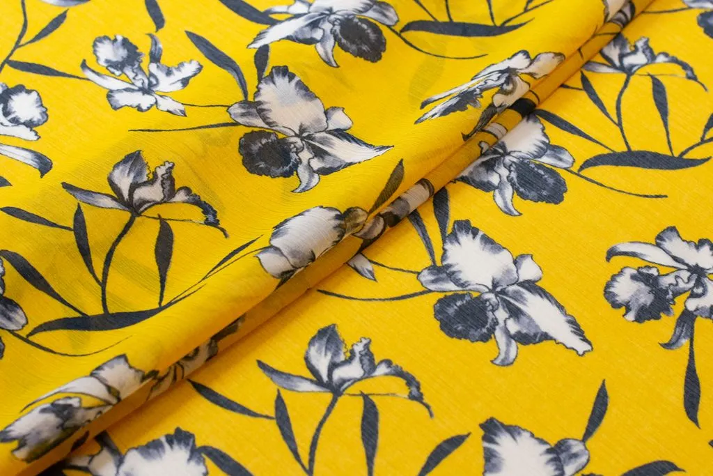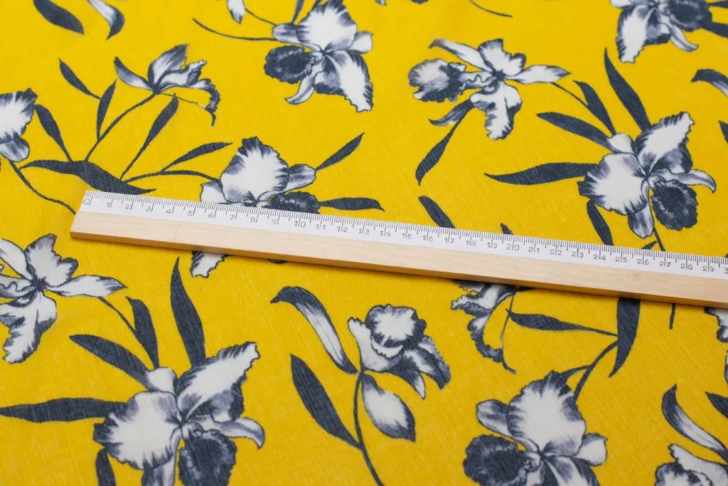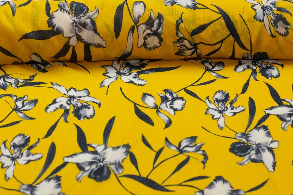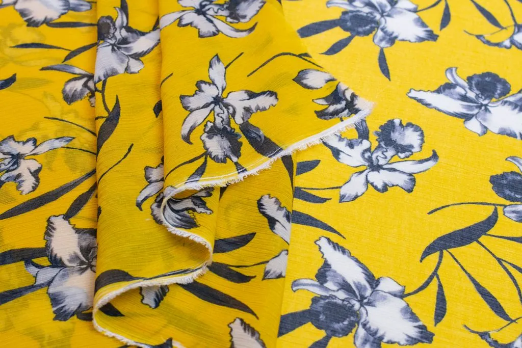 Шифон с жатым эффектом, рисунок "орхидеи" на желтом фоне