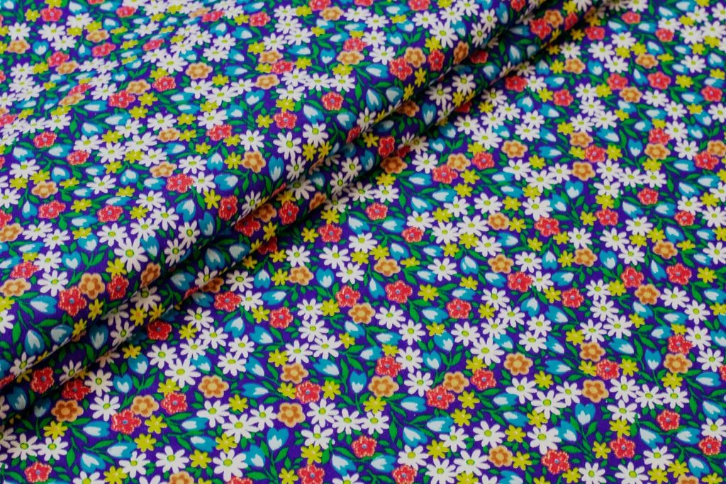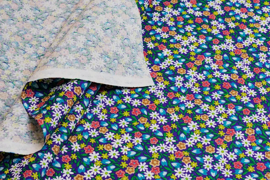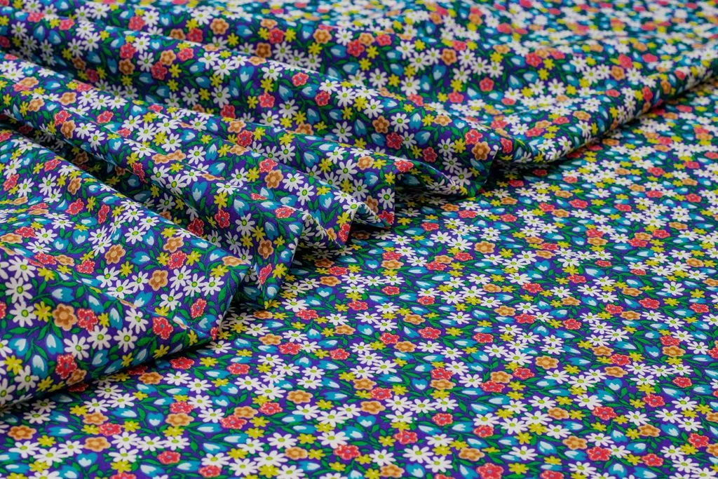 Рубашечно-плательный хлопок с рисунком "Ромашки и тюльпаны" на синем фоне