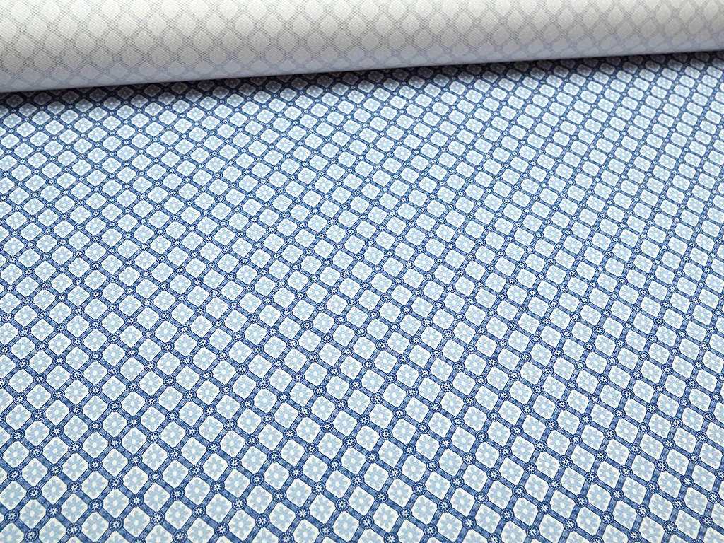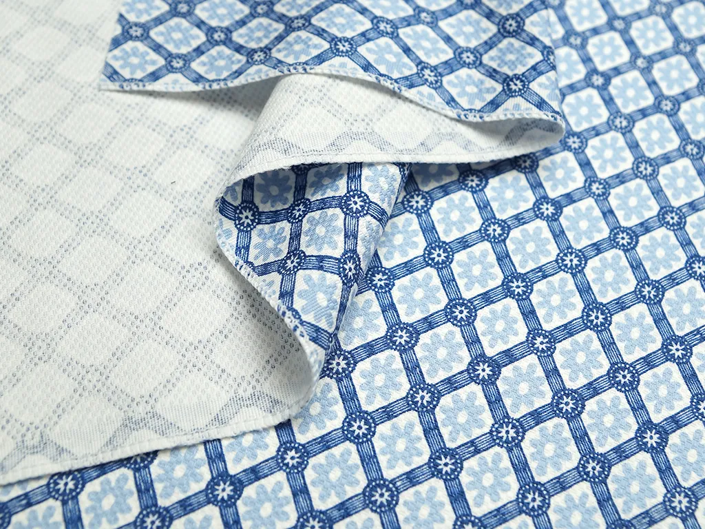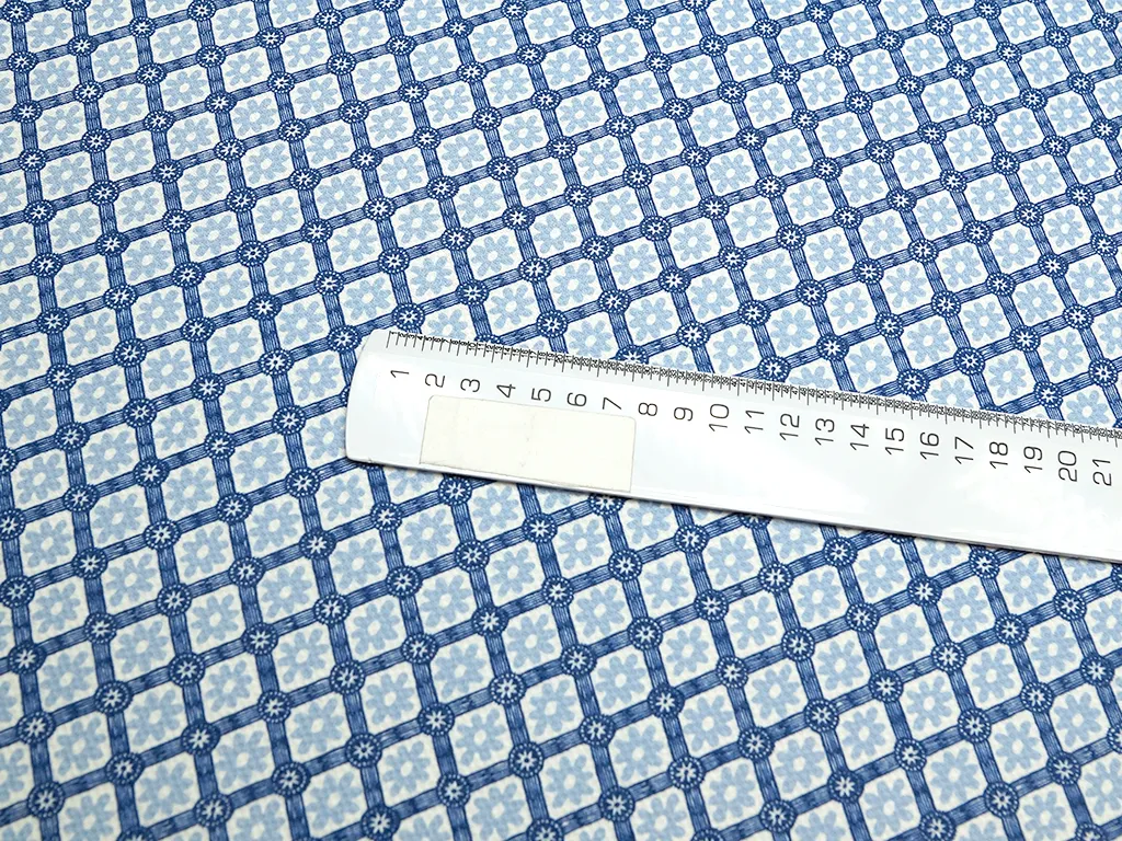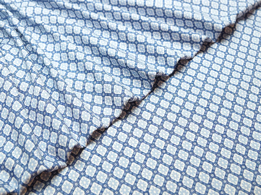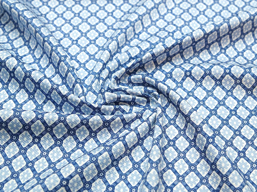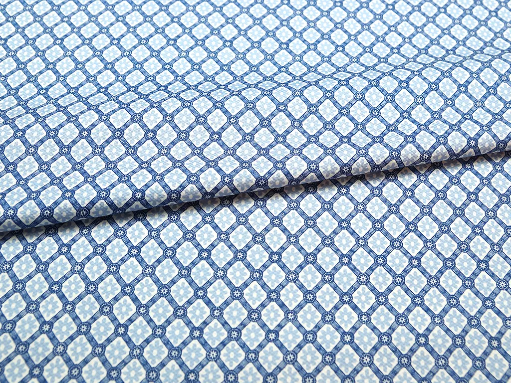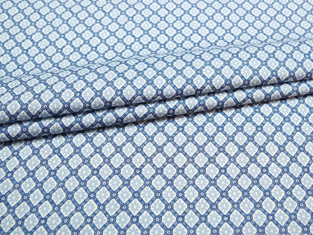 Стильный жаккардовый хлопок пике с добавлением эластана. Рисунок на ткани - стилизованные ромбы в сочетании белого, голубого и синего цветов. Ткань не просвечивает, очень приятна на ощупь, формодержащая. Отлично для пошива брюк, жакета или платья.