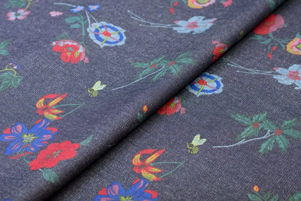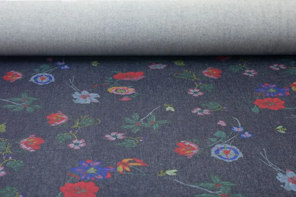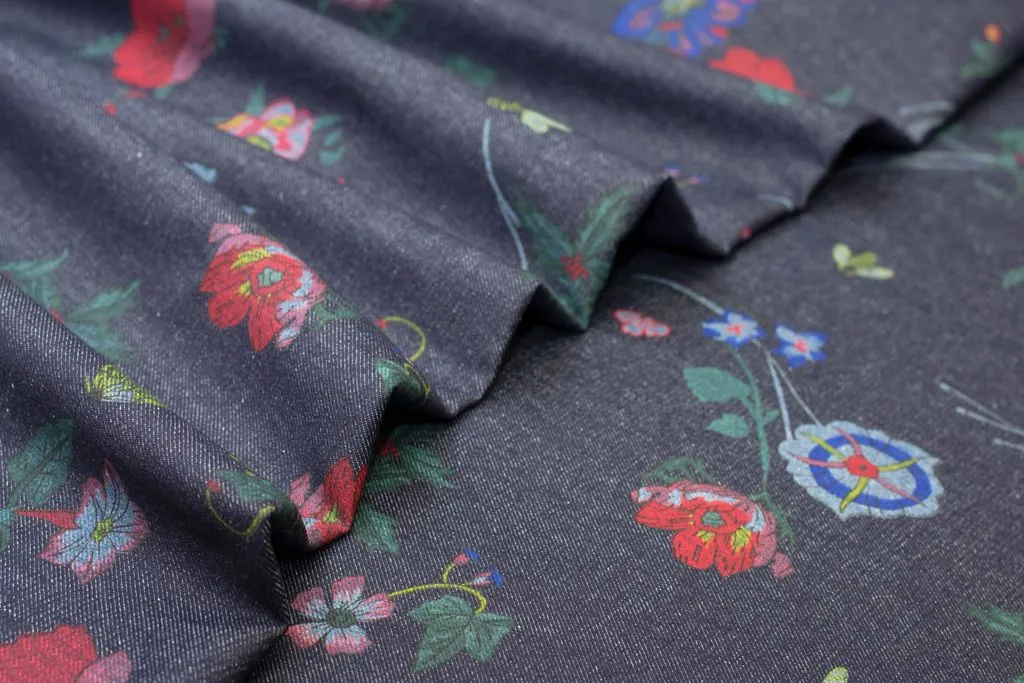 Джинса плотная с рисунком "Цветочки"на синем фоне