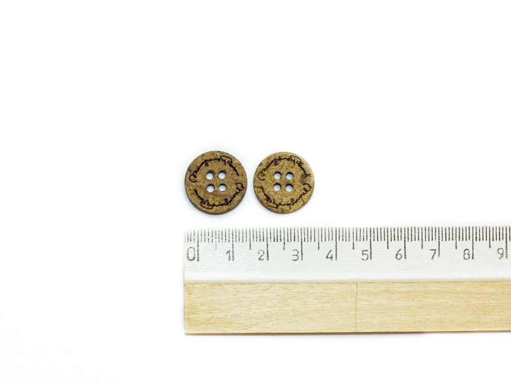 Пуговица кокосовая, костюмная, 4 прокола, бежевый меланж, с надписью, диаметр 18 мм