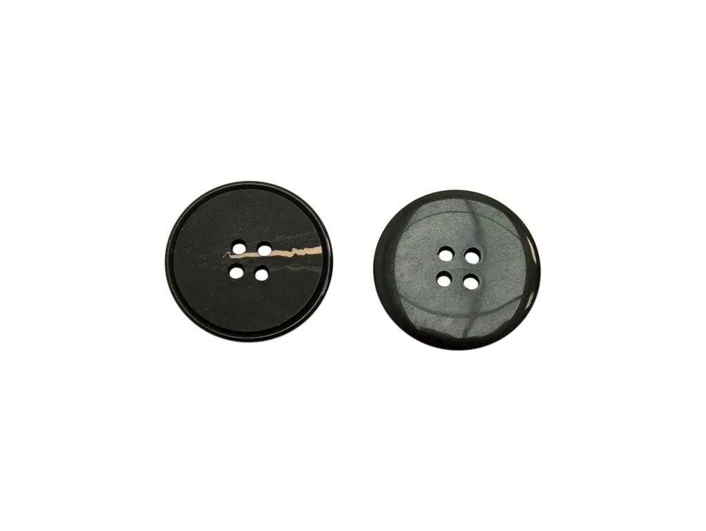 Пуговица пластмассовая костюмная, 4 прокола, матовая,чёрная с бежевым штрихом, диаметр 28 мм