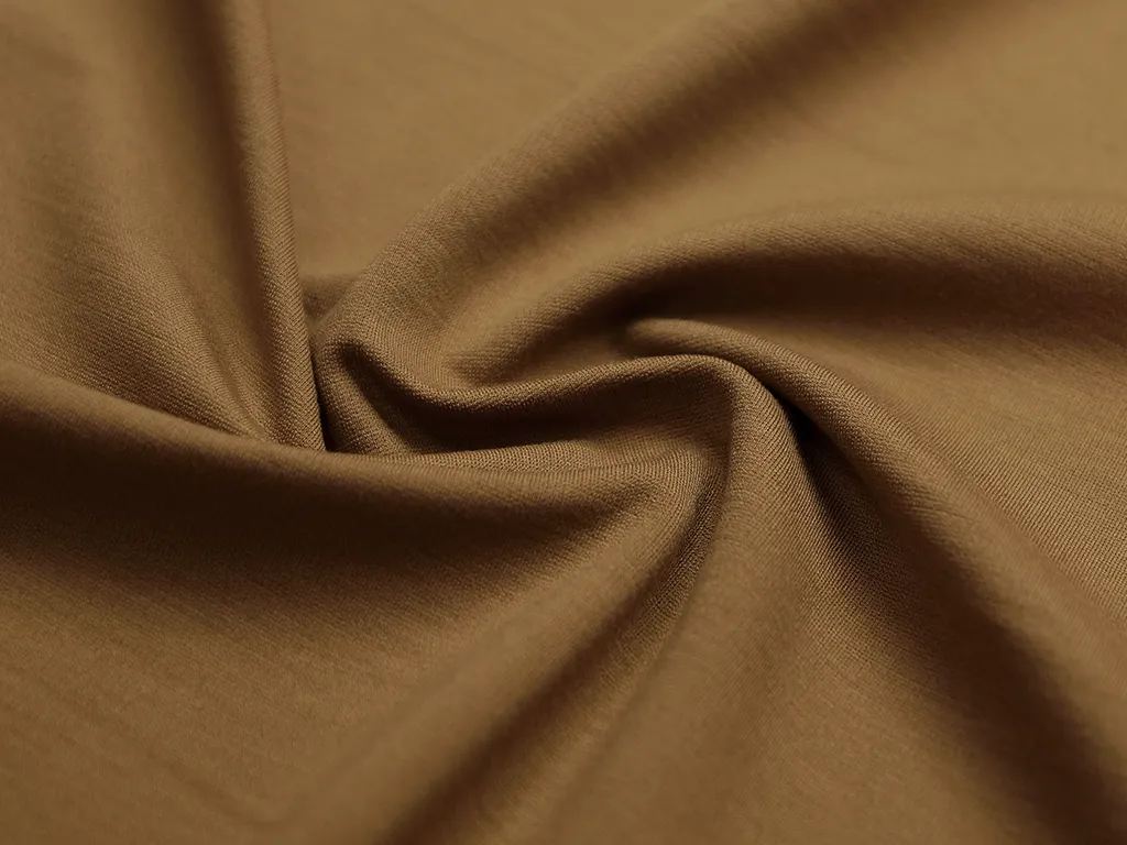 Джерси однотонное, костюмно-плательной группы. Цвет коричнево-бежевый. Ткань пластичная, мягкая, приятна к телу, хорошо драпируется, не образует заломы и не скатывается. Долго не теряет яркость цвета. При растяжении возвращается в первоначальную форму без потери качества. Подходит для пошива костюмов, юбок и брюк.