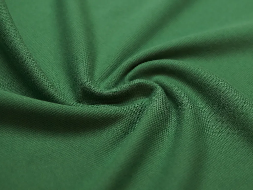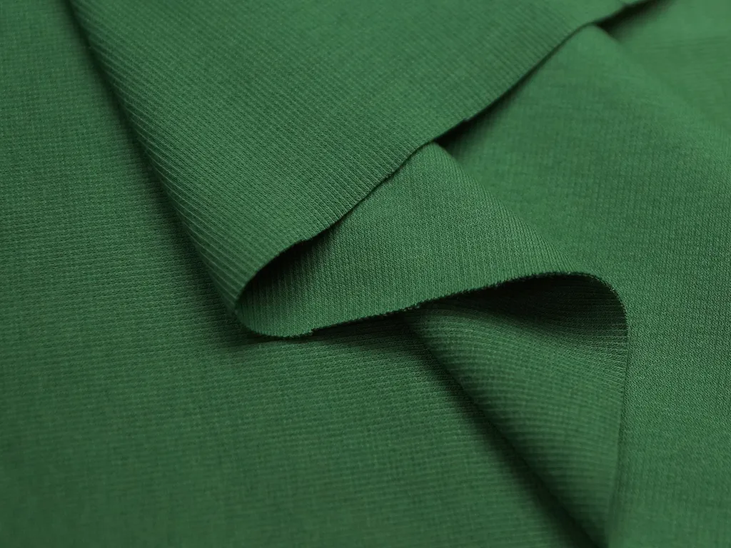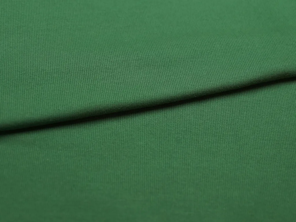 Трикотажный хлопковый материал (кашкорсе) зеленого цвета достаточно плотный, но при этом приятный и мягкий на ощупь. Трикотаж экологичен, эластичен, достаточно прочный, стойкий к износу, не садится и не линяет, при растяжении возвращается в исходную форму. Идеально подходит для пошива одежды для дома, штанов, пижам, шапок и для отделки манжетов и воротов.