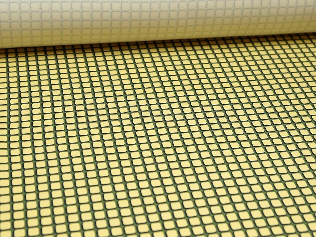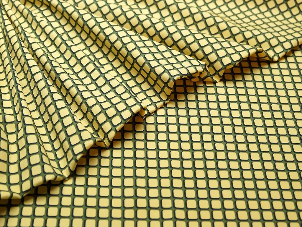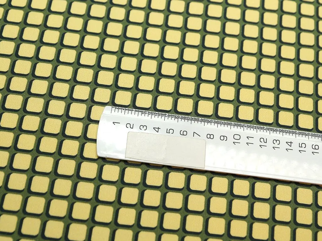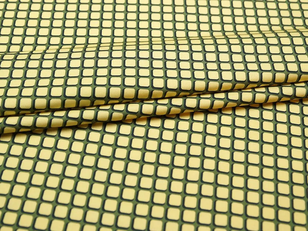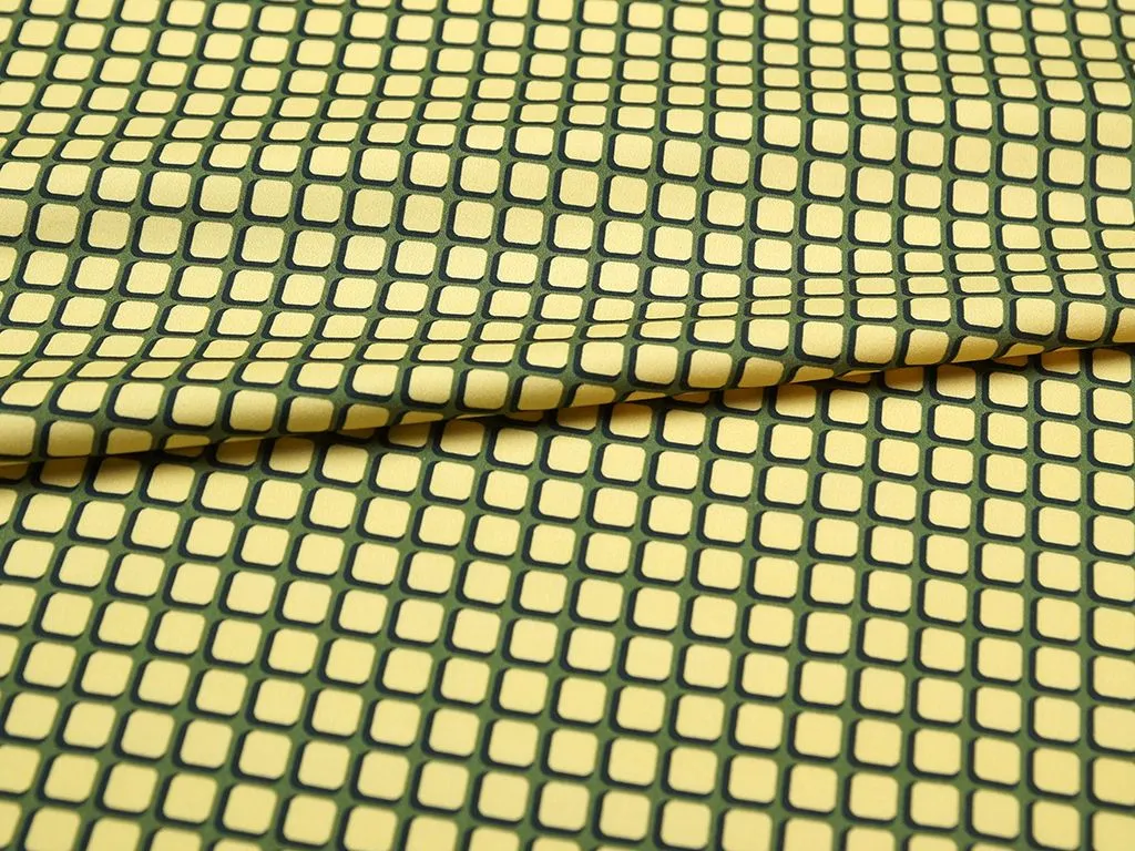 Костюмно-плательный хлопок с добавлением эластана, стилизованный геометрический принт, основной цвет светло-желтый в сочетании оливкового и черного. Ткань тактильно очень приятная, средней плотности, низкая сминаемость, хорошо драпируется, держит форму. Подходит для пошива одежды: костюмы, жакеты, платья, брюки и юбки.