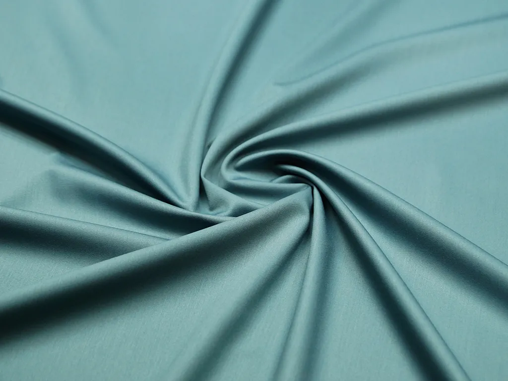 Легкая костюмно-плательная ткань из поливискозы с добавлением эластана, цвет серый с мятным подтоном. Материал тактильно очень приятный и мягкий, тонкий по плотности, с низкой сминаемостью и хорошо драпируется. Подойдет для пошива офисной и повседневной одежды, особенно в летний сезон: костюмы, платья, брюки, шорты, юбки и жакеты.