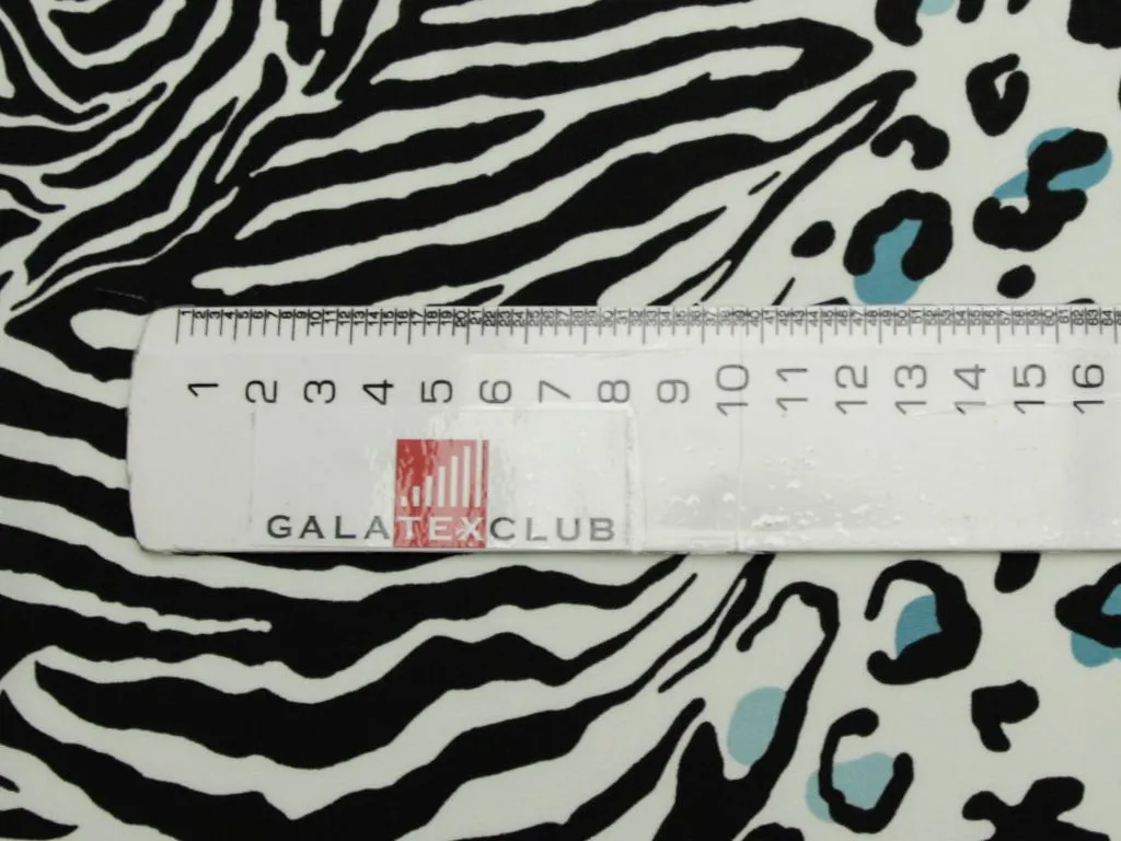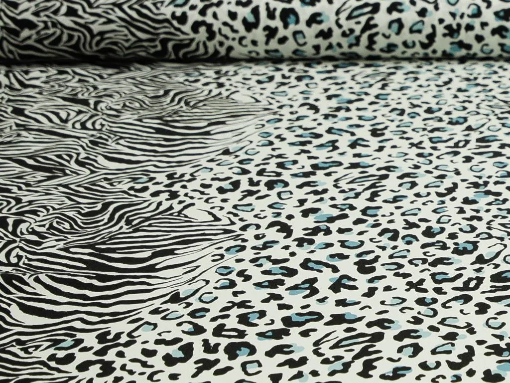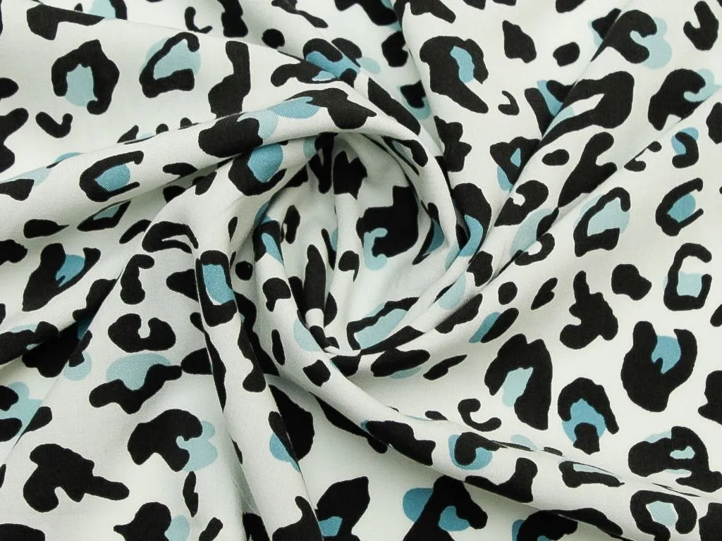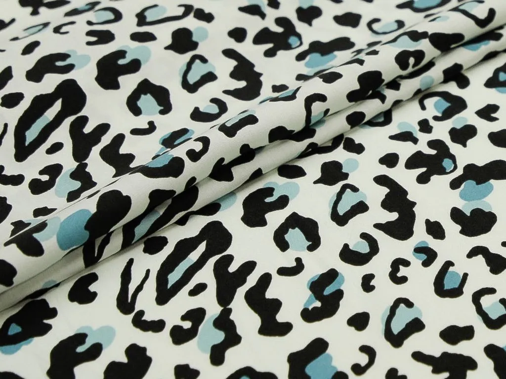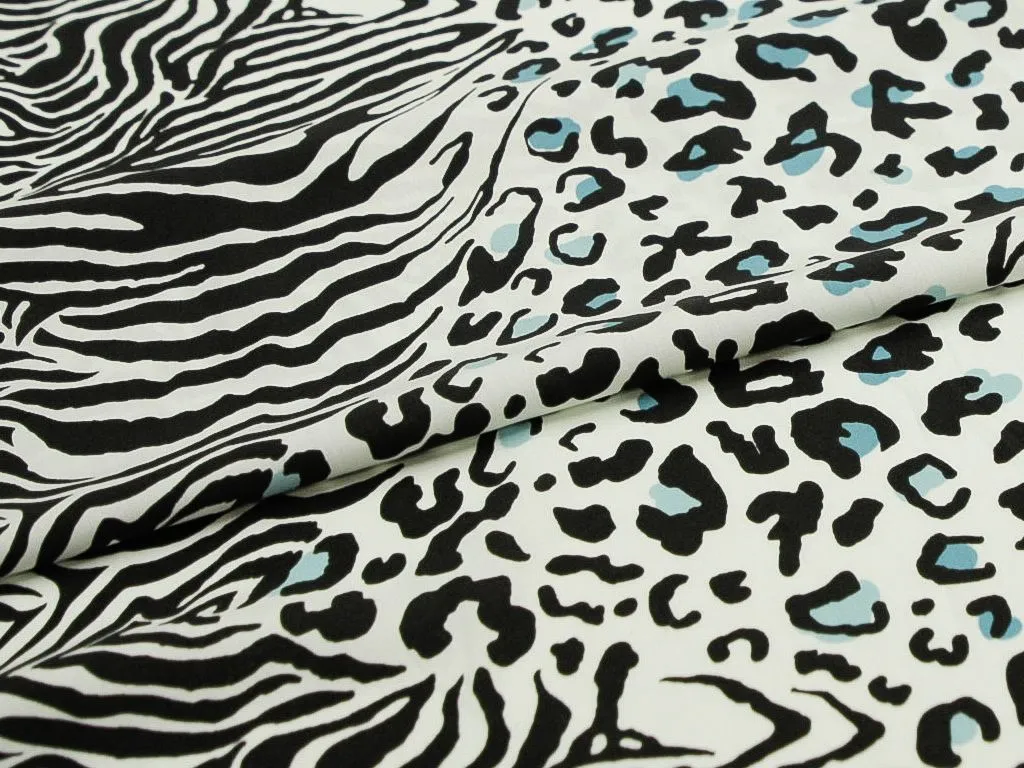 Плательная ткань с анималистическим рисунком на нежно-голубом фоне