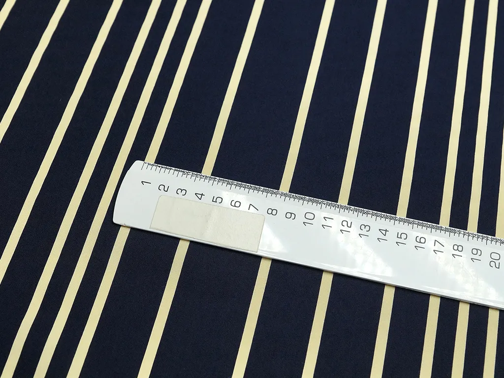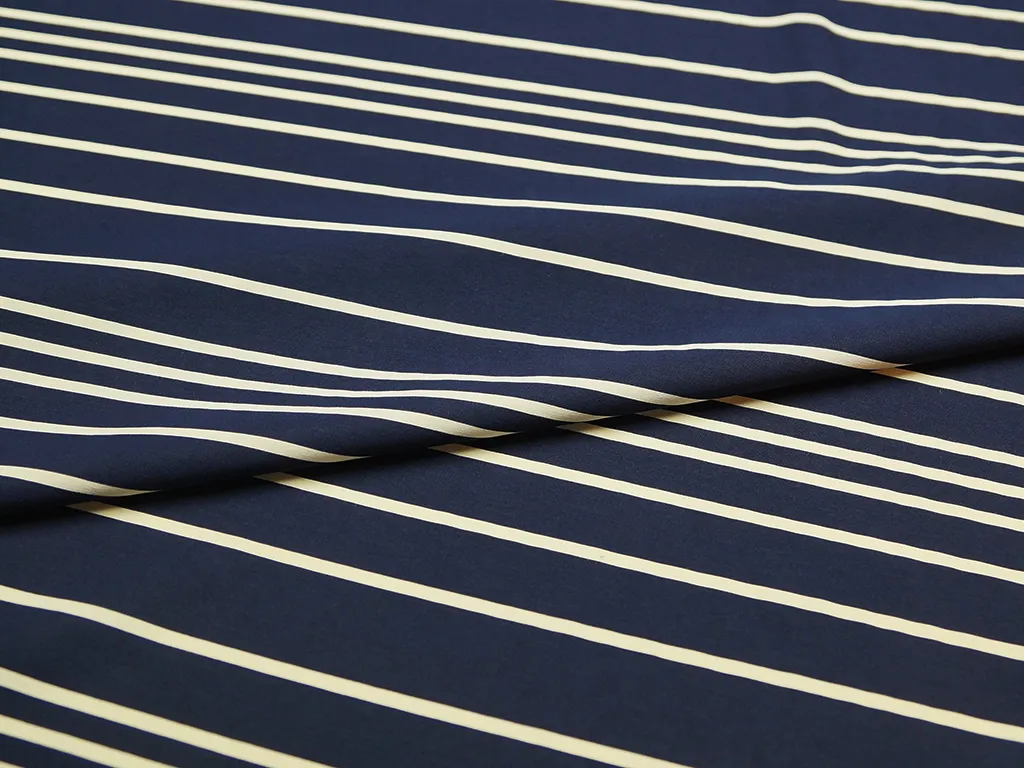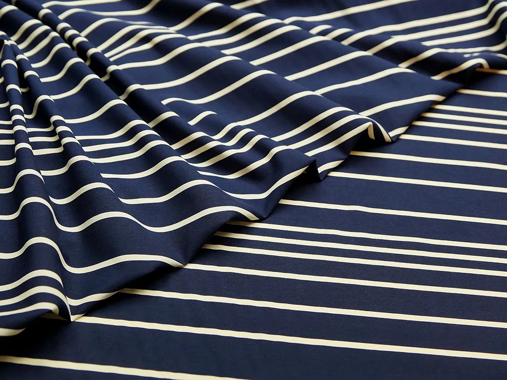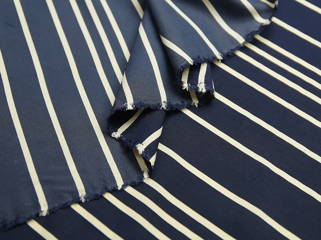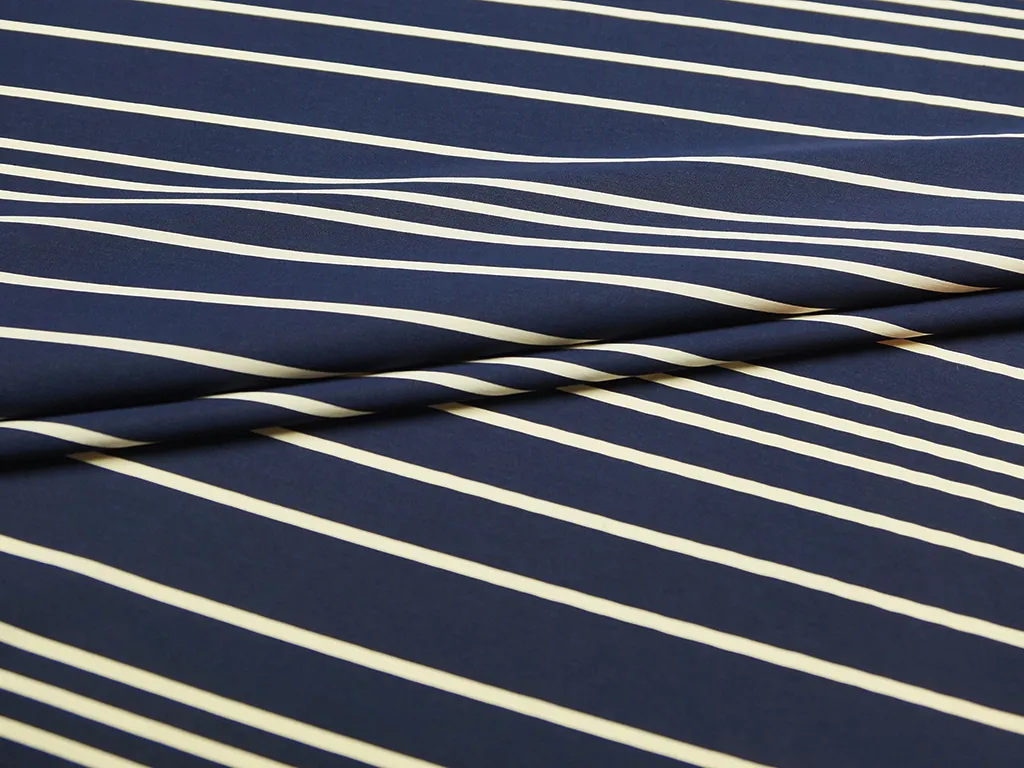 Плательная ткань в горизонтальную полоску на темно-синем фоне