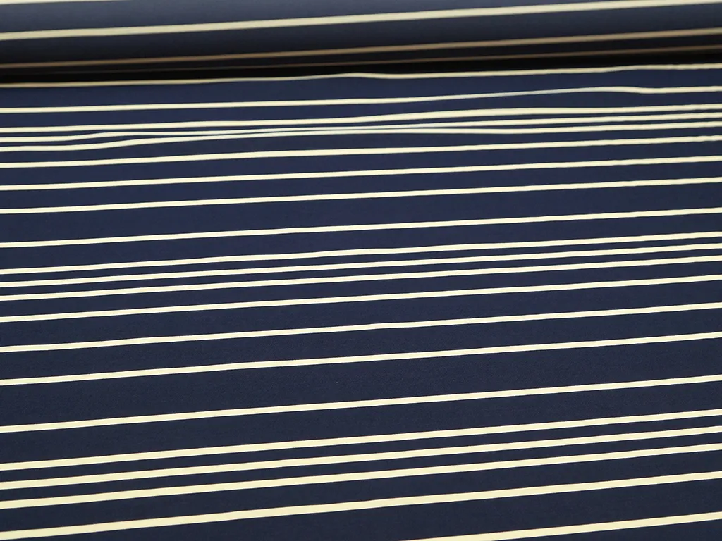 Великолепная плательная ткань из вискозы в светло-бежевую полоску на синем фоне. Материал приятный на ощупь, слегка держит форму, не просвечивает. Подходит для пошива платья, сарафана, юбки.