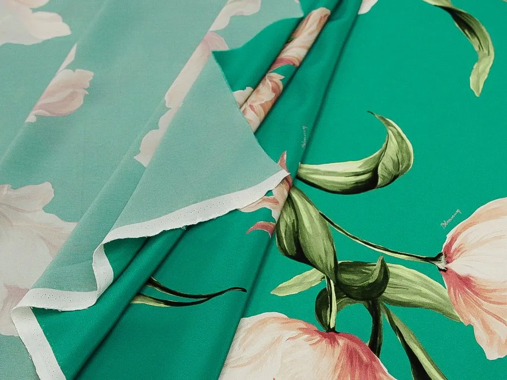 Блузочно-плательный шелк креповый "Тюльпаны" , фон бирюзовый