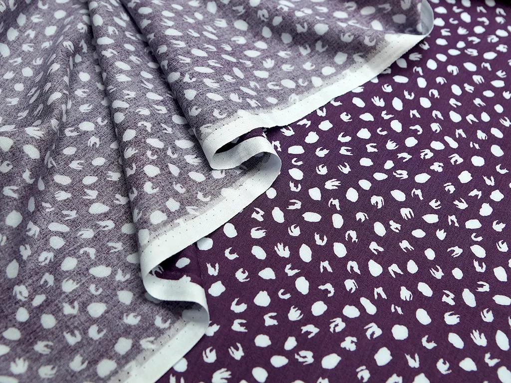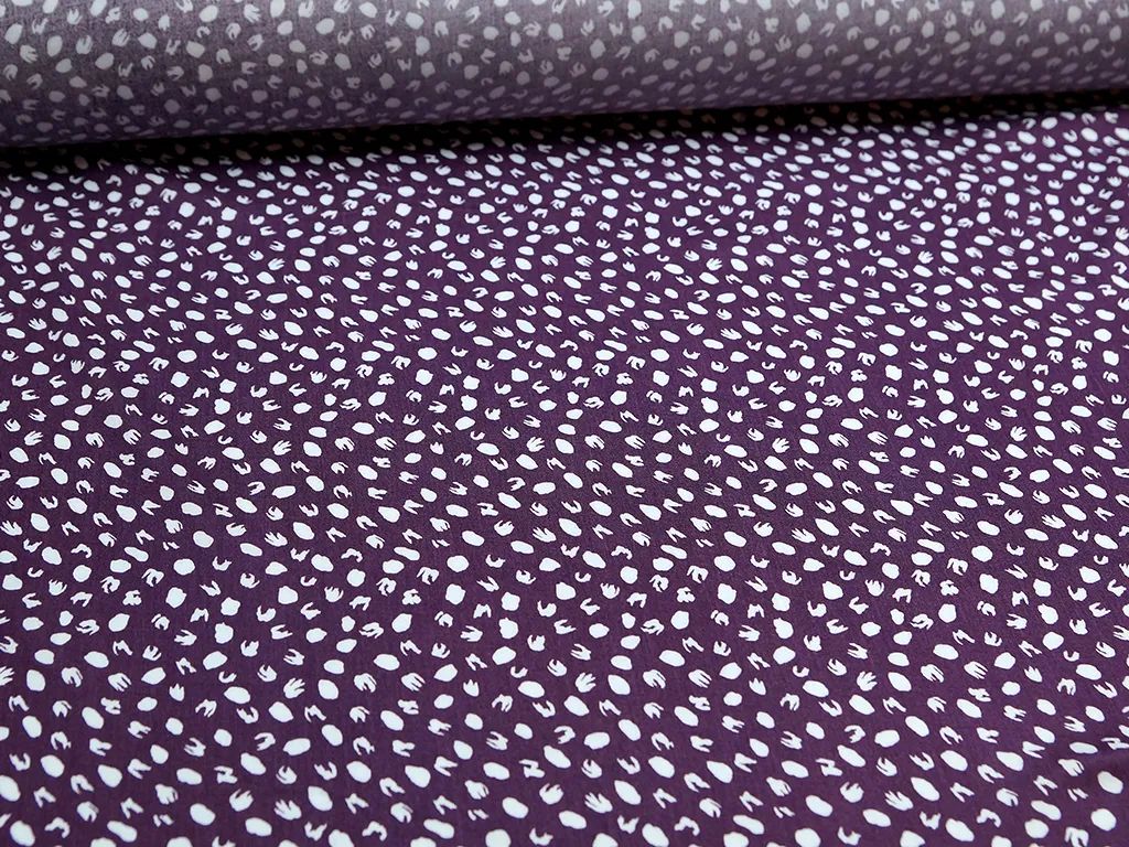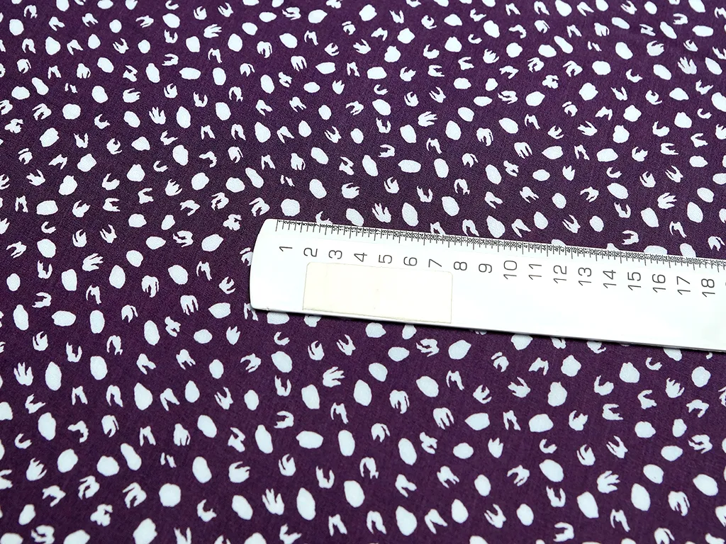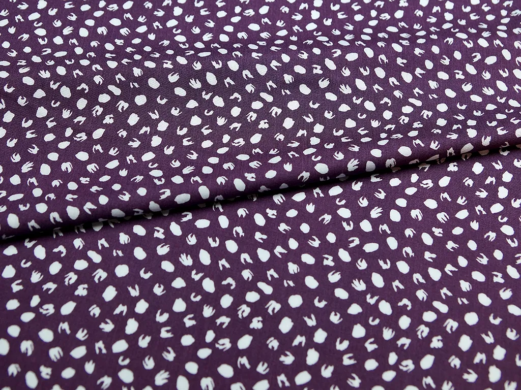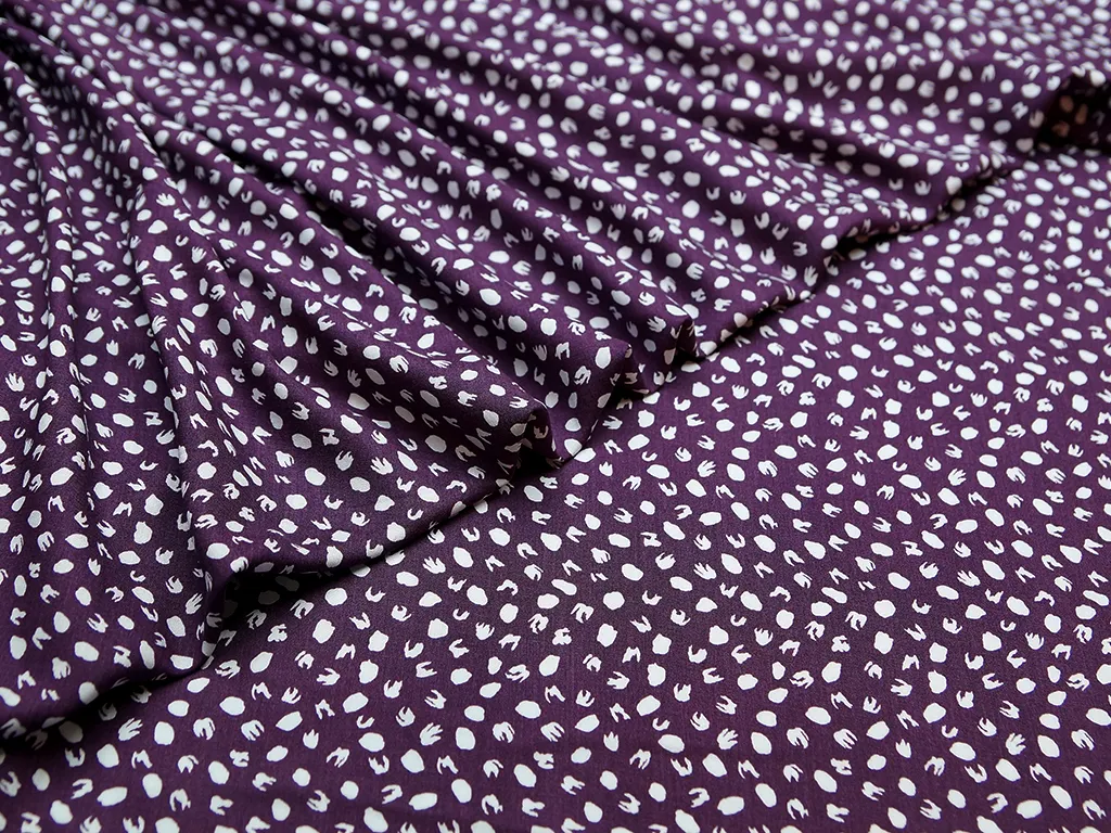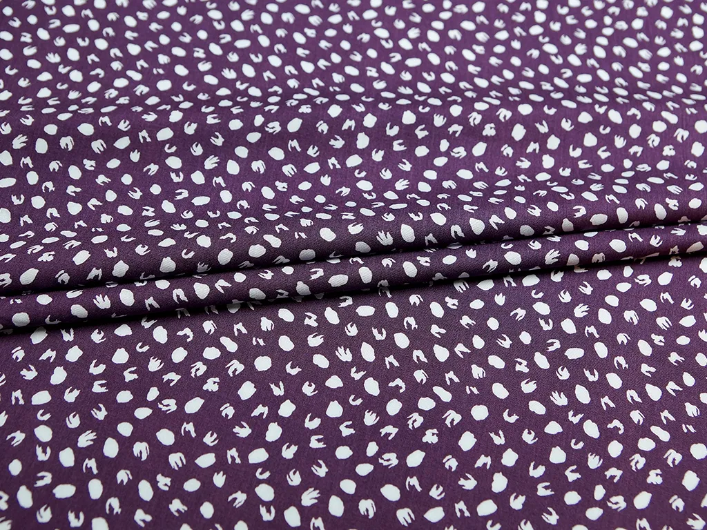 Штапель из вискозы с абстрактным мелким принтом белого цвета на фиолетовом фоне. Материал мягкий, нежный, приятный на ощупь, струящийся, имеет матовую шелковистую поверхность, при драпировке образует красивые складки, практически не просвечивает. Ткань экологична, гипоаллергенна, воздухопроницаема, гигроскопична, не накапливает статического электричества. Применяется при пошиве летних сарафанов, платьев, юбок, блузок и стильных рубашек.